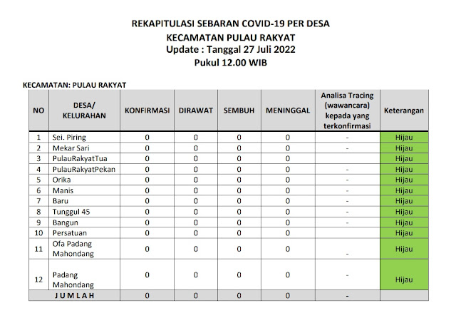 Kecamatan Pulau Rakyat kembali raih predikat zona hijau sebaran Covid 19 pada Rabu (27/07/2022). Hal ini terlihat pada tabel laporan harian covid yang dihimpun dari seluruh desa di Kecamatan Pulau Rakyat tidak ada tambahan kasus yang terjadi. Jumlah kasus konfirmasi sebanyak 0 kasus, jumlah dirawat 0 kasus, jumlah sembuh 0 kasus dan jumlah meninggal juga 0 kasus.
