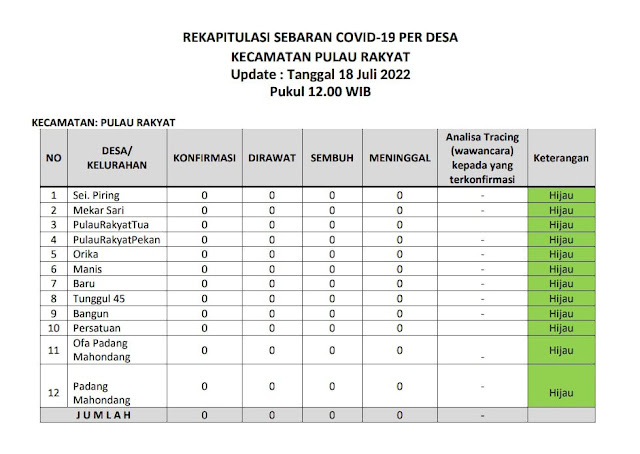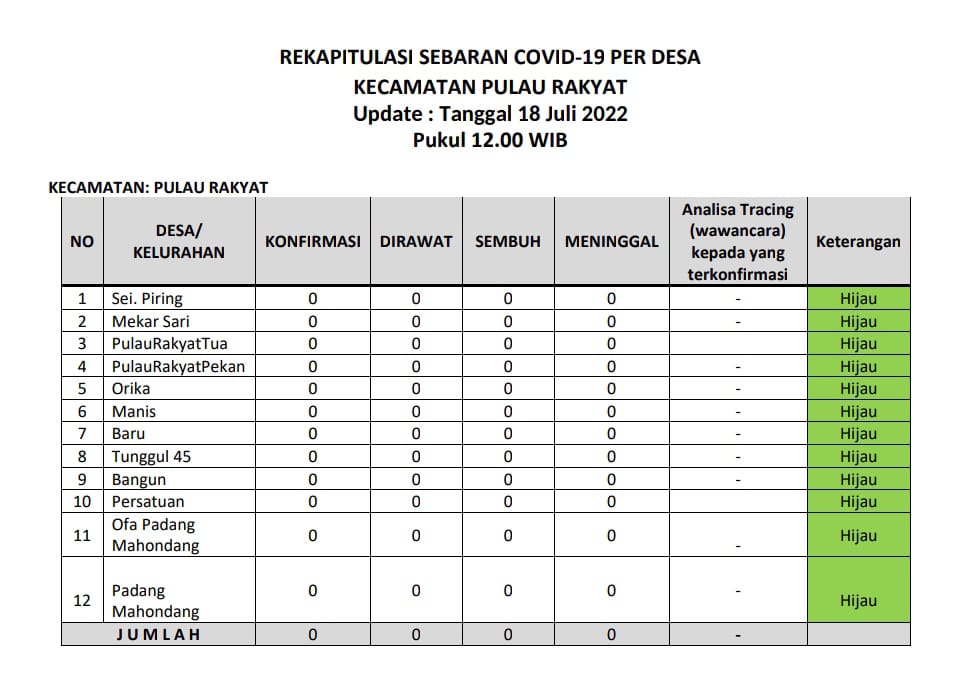 Mengawali minggu ke-3 bulan Juli 2022 Kecamatan Pulau Rakyat tetap pada zona hijau sebaran covid 19 pada Senin (18 Juli 2022). Berdasarkan tabel upadate data harian covid 19 kecamatan Pulau Rakyat di atas dapat dilihat bahwa jumla kasus di konfirmasi sebanyak 0 kasus, jumlah dirawat 0 kasus, jumlah sembuh sebanyak 0 kasus dan jumlah meninggal juga 0 kasus.