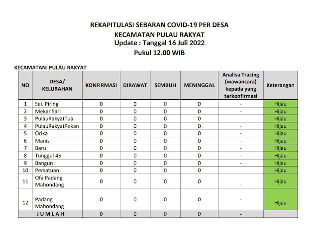 Predikat zona hijau sebaran covid 19 kembali dipertahankan Kecamatan Pulau Rakyat pada Sabtu (16 Juli2022). Hal ini dibuktikan dengan tidak adanya tambahan kasus baru covid 19 dari hari sebelumnya. Jumlah kasus yang di konfirmasi sebanyak 0 kasus, jumlah dirawat 0 kasus, jumlah sembuh sebanyak 0 kasus dan jumlah meninggal sebanyak 0 kasus.