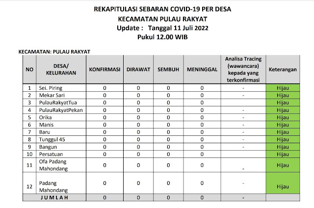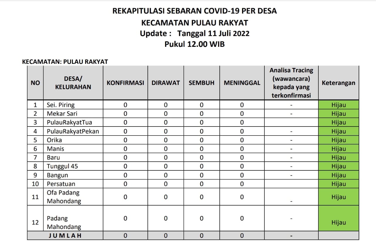 Berdasarkan pengumpulan data dari tiap desa se-Kecamatan Pulau Rakyat untuk perkembangan sebaran covid-19 menunjukan bahwa Kecamatan Pulau Rakyat pada tanggal 11 Juli 2022 berada dalam zona hijau. Hal ini dikarenakan tidak adanya kasus terpapar covid-19 di kecamatan Pulau Rakyat. Dari seluruh desa untuk terkonfirmasi covid jumlah 0 kasus, untuk dirawat suspect covid jumlah 0 kasus, sembuh covid julah 0 kasus dan meninggal karena covid 0 kasus.