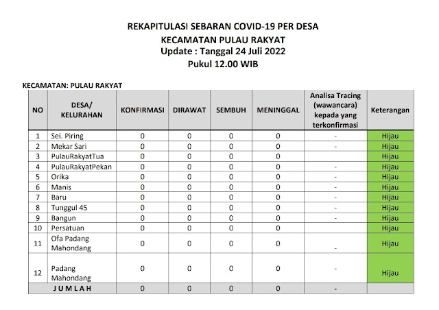 Kecamatan Pulau Rakyat tetap pada status zona hijau sebaran Covid 19 Minggu (24/07/2022). Hal ini terlihat pada tabel laporan harian sebaran covid yang dihimpun dari seluruh desa di Kecamatan Pulau Rakyat tidak ada tambahan kasus yang terjadi. Jumlah kasus konfirmasi sebanyak 0 kasus, jumlah dirawat 0 kasus, jumlah sembuh 0 kasus dan jumlah meninggal juga 0 kasus.