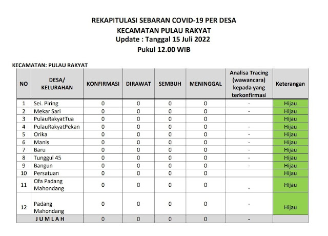Tidak ada tambahan kasus Covid 19, Kecamatan Pulau Rakyat pertahankan status zona hijau covid 19 Jum'at (15 Juli 2022). Dari tabel di atas dapat dilihat bahwa jumlah konfirmasi 0 kasus, jumlah dirawat 0 kasus, jumlah sembuh 0 kasus dan jumlah meninggal 0 kasus. Dengan tidak adanya kasus covid maka kecamatan Pulau Rakyat kembali mendapatkan predikat zona hijau.