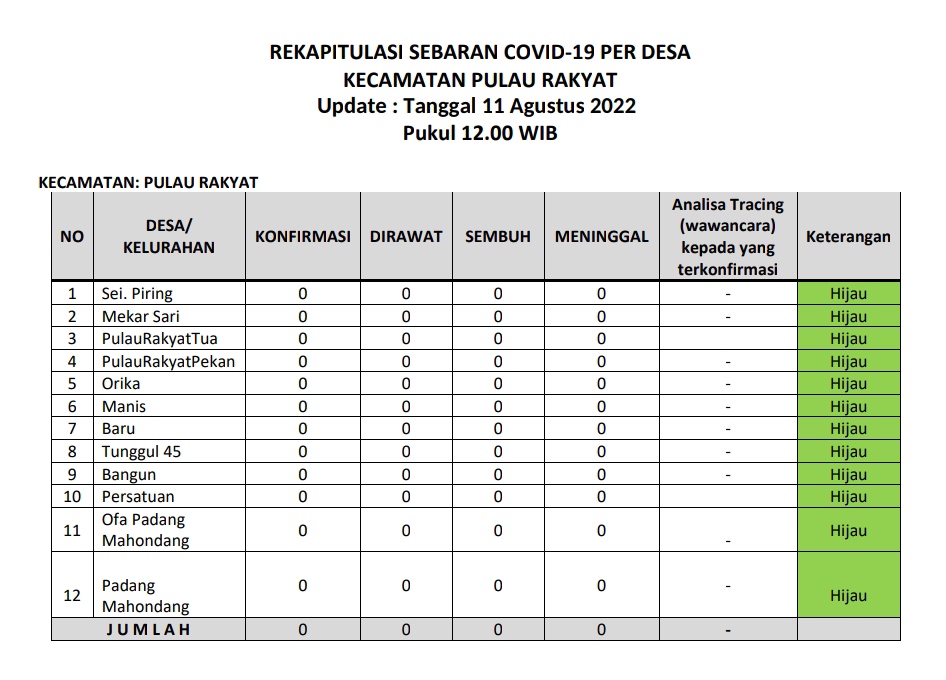 Kecamatan Pulau Rakyat berada dalam zona hijau sebaran covid 19 pada Kamis (11 Agustus 2022). Hal ini terlihat dari tabel laporan harian sebaran covid 19 dari tiap desa di wilayah Kecamatan Pulau Rakyat. Jumlah terkonfirmasi 0 kasus, jumlah pasien dirawat 0 kasus, jumlah kasus sembuh 0 kasus dan jumlah meninggal 0 kasus.