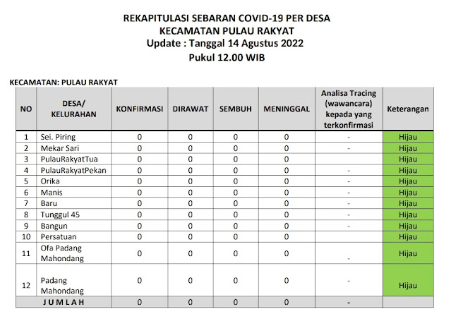 Kecamatan Pulau Rakyat berada dalam zona hijau sebaran covid 19 pada Minggu (14 Agustus 2022). Hal ini terlihat dari tabel laporan harian sebaran covid 19 dari tiap desa di wilayah Kecamatan Pulau Rakyat. Jumlah terkonfirmasi 0 kasus, jumlah pasien dirawat 0 kasus, jumlah kasus sembuh 0 kasus dan jumlah meninggal 0 kasus.