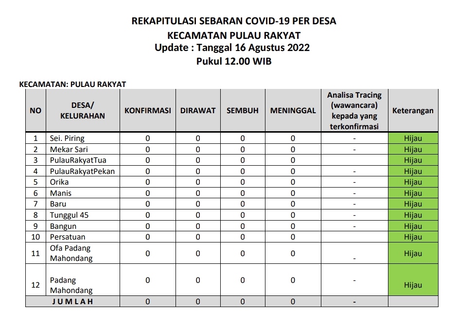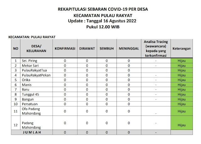 Kecamatan Pulau Rakyat berada dalam zona hijau sebaran covid 19 pada Selasa (16 Agustus 2022). Hal ini terlihat dari tabel laporan harian sebaran covid 19 dari tiap desa di wilayah Kecamatan Pulau Rakyat. Jumlah terkonfirmasi 0 kasus, jumlah pasien dirawat 0 kasus, jumlah kasus sembuh 0 kasus dan jumlah meninggal 0 kasus.