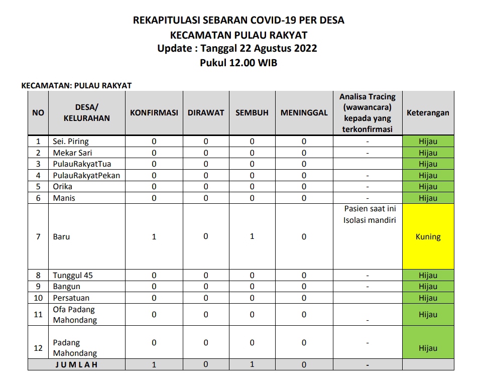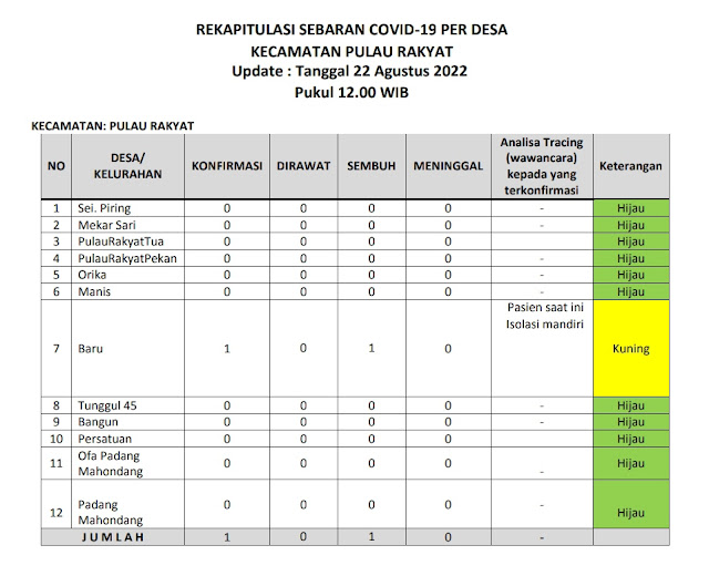 Kecamatan Pulau Rakyat berada dalam zona hijau sebaran covid 19 di Sebelas (11) desa dan satu (1) desa berada dalam zona kuning yakni Desa Baru pada Senin (22 Agustus 2022). Hal ini terlihat dari tabel laporan harian sebaran covid 19 dari tiap desa di wilayah Kecamatan Pulau Rakyat. Jumlah terkonfirmasi 1 kasus, jumlah pasien dirawat 0 kasus, jumlah kasus sembuh 1 kasus dan jumlah meninggal 0 kasus.