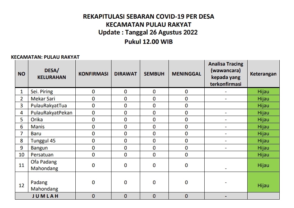 Kecamatan Pulau Rakyat berada dalam zona hijau sebaran covid 19 pada Jum'at (26 Agustus 2022). Hal ini terlihat dari tabel laporan harian sebaran covid 19 dari tiap desa di wilayah Kecamatan Pulau Rakyat. Jumlah terkonfirmasi 0 kasus, jumlah pasien dirawat 0 kasus, jumlah kasus sembuh 0 kasus dan jumlah meninggal 0 kasus.