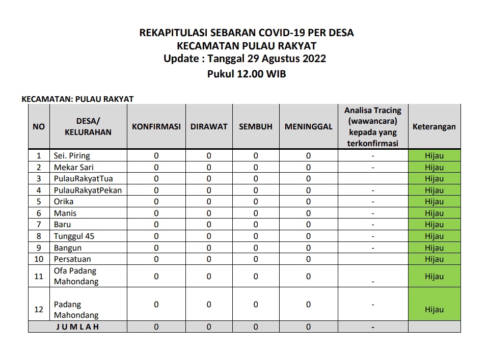 Kecamatan Pulau Rakyat berada dalam zona hijau sebaran covid 19 pada Senin (29 Agustus 2022). Hal ini terlihat dari tabel laporan harian sebaran covid 19 dari tiap desa di wilayah Kecamatan Pulau Rakyat. Jumlah terkonfirmasi 0 kasus, jumlah pasien dirawat 0 kasus, jumlah kasus sembuh 0 kasus dan jumlah meninggal 0 kasus.