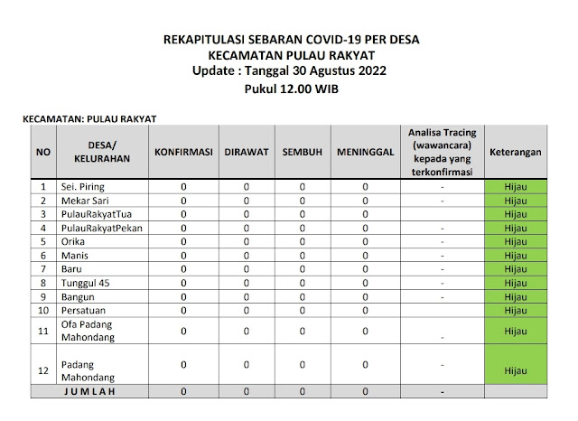 Kecamatan Pulau Rakyat berada dalam zona hijau sebaran covid 19 pada Selasa (30 Agustus 2022). Hal ini terlihat dari tabel laporan harian sebaran covid 19 dari tiap desa di wilayah Kecamatan Pulau Rakyat. Jumlah terkonfirmasi 0 kasus, jumlah pasien dirawat 0 kasus, jumlah kasus sembuh 0 kasus dan jumlah meninggal 0 kasus.