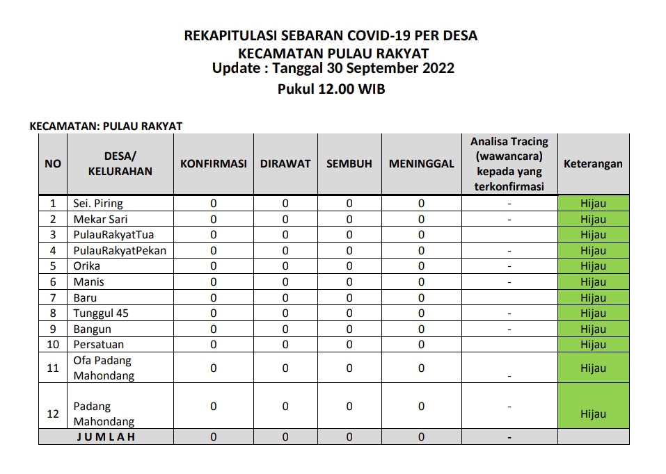Kecamatan Pulau Rakyat berada dalam zona hijau sebaran covid 19 pada Jum'at (30 September 2022). Hal ini terlihat dari tab…