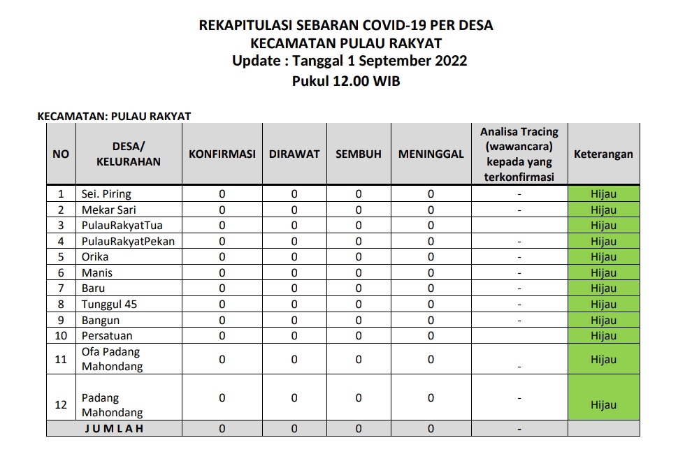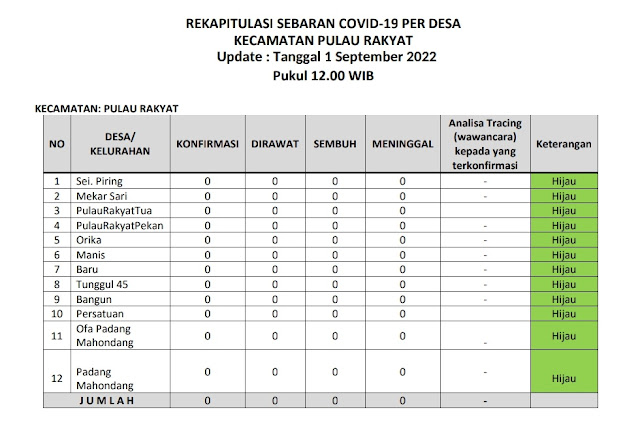 Kecamatan Pulau Rakyat berada dalam zona hijau sebaran covid 19 pada Kamis (01 September 2022). Hal ini terlihat dari tabel laporan harian sebaran covid 19 dari tiap desa di wilayah Kecamatan Pulau Rakyat. Jumlah terkonfirmasi 0 kasus, jumlah pasien dirawat 0 kasus, jumlah kasus sembuh 0 kasus dan jumlah meninggal 0 kasus.