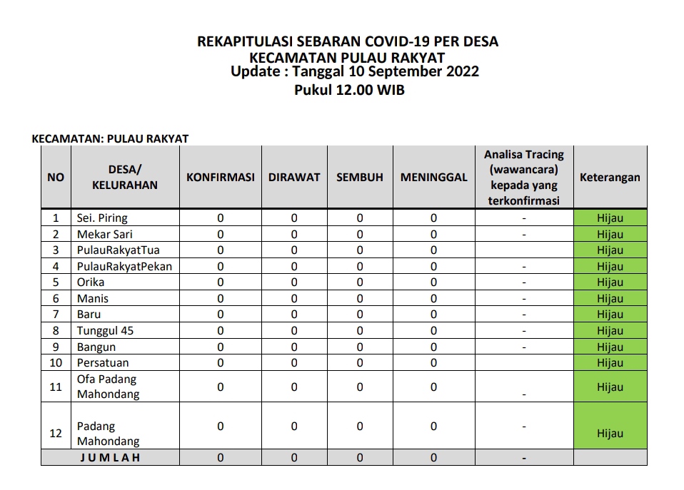Kecamatan Pulau Rakyat berada dalam zona hijau sebaran covid 19 pada Sabtu (10 September 2022). Hal ini terlihat dari tabel laporan harian sebaran covid 19 dari tiap desa di wilayah Kecamatan Pulau Rakyat. Jumlah terkonfirmasi 0 kasus, jumlah pasien dirawat 0 kasus, jumlah kasus sembuh 0 kasus dan jumlah meninggal 0 kasus.