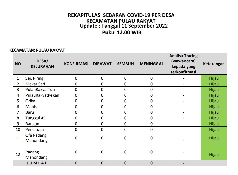 Kecamatan Pulau Rakyat berada dalam zona hijau sebaran covid 19 pada Minggu (11 September 2022). Hal ini terlihat dari tabel laporan harian sebaran covid 19 dari tiap desa di wilayah Kecamatan Pulau Rakyat. Jumlah terkonfirmasi 0 kasus, jumlah pasien dirawat 0 kasus, jumlah kasus sembuh 0 kasus dan jumlah meninggal 0 kasus.