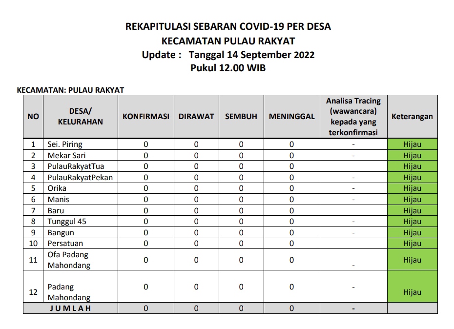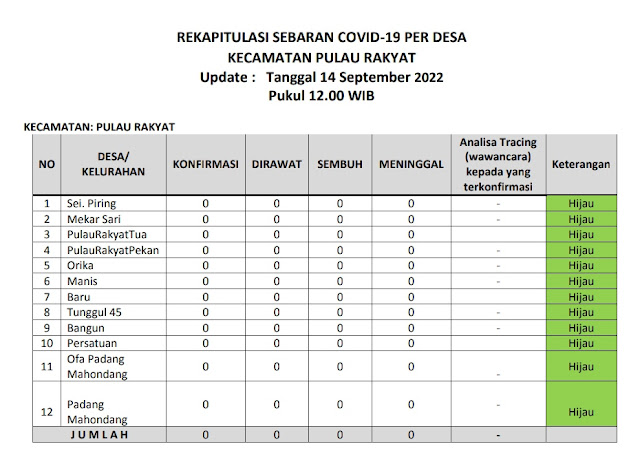 Kecamatan Pulau Rakyat berada dalam zona hijau sebaran covid 19 pada Rabuu (14 September 2022). Hal ini terlihat dari tabel laporan harian sebaran covid 19 dari tiap desa di wilayah Kecamatan Pulau Rakyat. Jumlah terkonfirmasi 0 kasus, jumlah pasien dirawat 0 kasus, jumlah kasus sembuh 0 kasus dan jumlah meninggal 0 kasus.