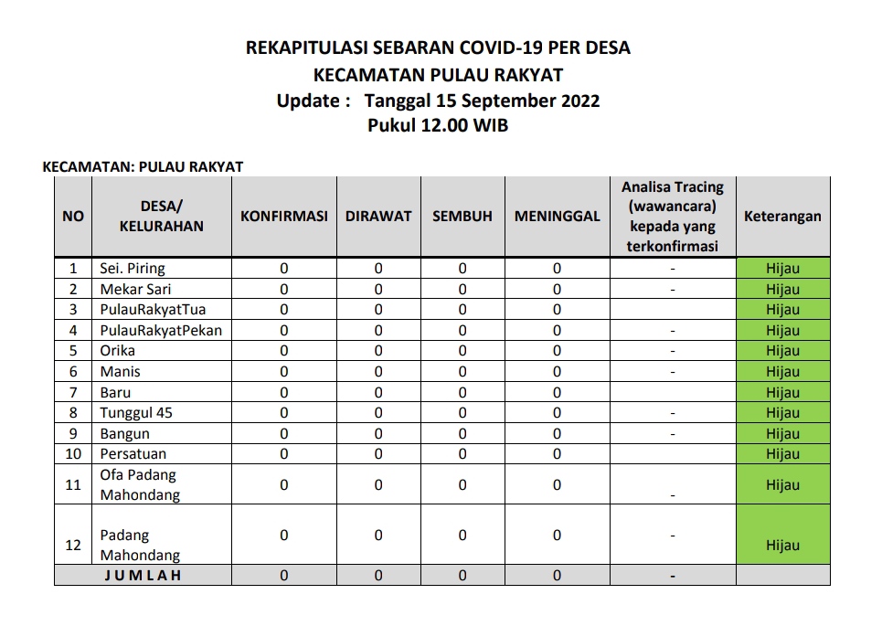 Kecamatan Pulau Rakyat berada dalam zona hijau sebaran covid 19 pada Kamis (15 September 2022). Hal ini terlihat dari tabel laporan harian sebaran covid 19 dari tiap desa di wilayah Kecamatan Pulau Rakyat. Jumlah terkonfirmasi 0 kasus, jumlah pasien dirawat 0 kasus, jumlah kasus sembuh 0 kasus dan jumlah meninggal 0 kasus.