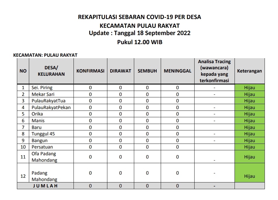Kecamatan Pulau Rakyat berada dalam zona hijau sebaran covid 19 pada Minggu (18 September 2022). Hal ini terlihat dari tabel laporan harian sebaran covid 19 dari tiap desa di wilayah Kecamatan Pulau Rakyat. Jumlah terkonfirmasi 0 kasus, jumlah pasien dirawat 0 kasus, jumlah kasus sembuh 0 kasus dan jumlah meninggal 0 kasus.