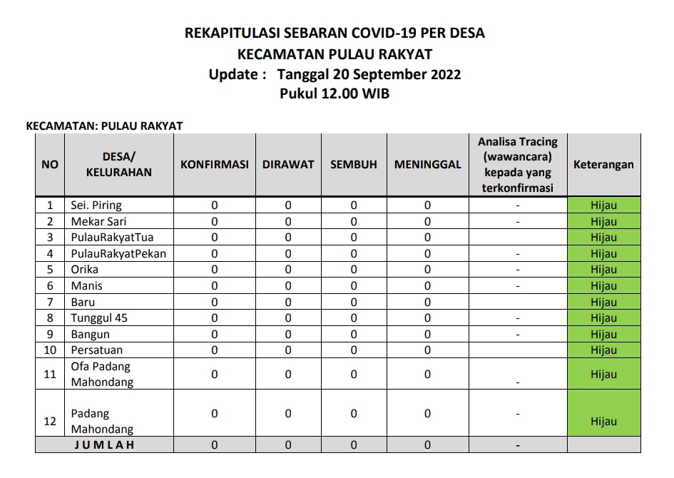 Kecamatan Pulau Rakyat berada dalam zona hijau sebaran covid 19 pada Selasa (20 September 2022). Hal ini terlihat dari tabel laporan harian sebaran covid 19 dari tiap desa di wilayah Kecamatan Pulau Rakyat. Jumlah terkonfirmasi 0 kasus, jumlah pasien dirawat 0 kasus, jumlah kasus sembuh 0 kasus dan jumlah meninggal 0 kasus.