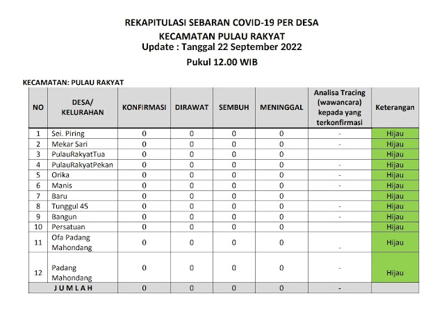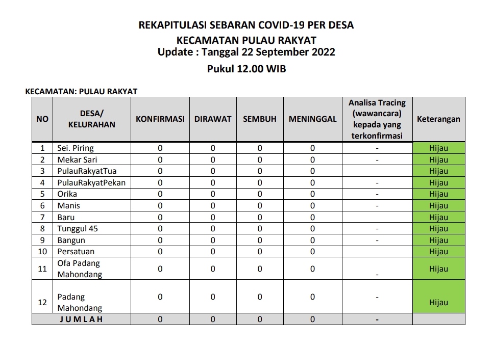 Kecamatan Pulau Rakyat berada dalam zona hijau sebaran covid 19 pada Kamis (22 September 2022). Hal ini terlihat dari tabel laporan harian sebaran covid 19 dari tiap desa di wilayah Kecamatan Pulau Rakyat. Jumlah terkonfirmasi 0 kasus, jumlah pasien dirawat 0 kasus, jumlah kasus sembuh 0 kasus dan jumlah meninggal 0 kasus.