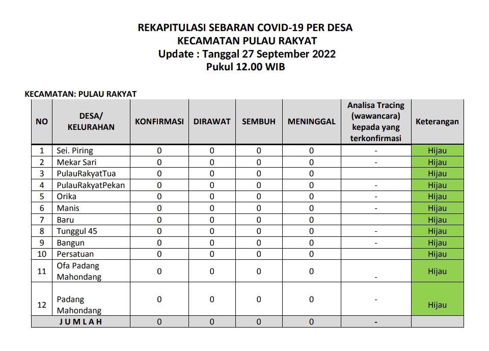 Kecamatan Pulau Rakyat berada dalam zona hijau sebaran covid 19 pada Selasa (27 September 2022). Hal ini terlihat dari tabel laporan harian sebaran covid 19 dari tiap desa di wilayah Kecamatan Pulau Rakyat. Jumlah terkonfirmasi 0 kasus, jumlah pasien dirawat 0 kasus, jumlah kasus sembuh 0 kasus dan jumlah meninggal dunia 0 kasus.
