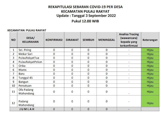 Kecamatan Pulau Rakyat berada dalam zona hijau sebaran covid 19 pada Sabtu (3 September 2022). Hal ini terlihat dari tabel laporan harian sebaran covid 19 dari tiap desa di wilayah Kecamatan Pulau Rakyat. Jumlah terkonfirmasi 0 kasus, jumlah pasien dirawat 0 kasus, jumlah kasus sembuh 0 kasus dan jumlah meninggal 0 kasus.