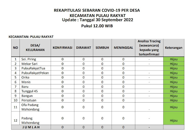 Kecamatan Pulau Rakyat berada dalam zona hijau sebaran covid 19 pada Jum'at (30 September 2022). Hal ini terlihat dari tabel laporan harian sebaran covid 19 dari tiap desa di wilayah Kecamatan Pulau Rakyat. Jumlah terkonfirmasi 0 kasus, jumlah pasien dirawat 0 kasus, jumlah kasus sembuh 0 kasus dan jumlah meninggal dunia 0 kasus.