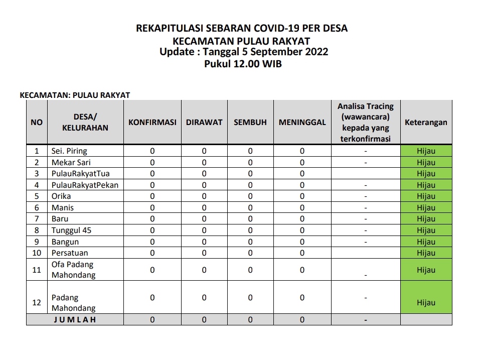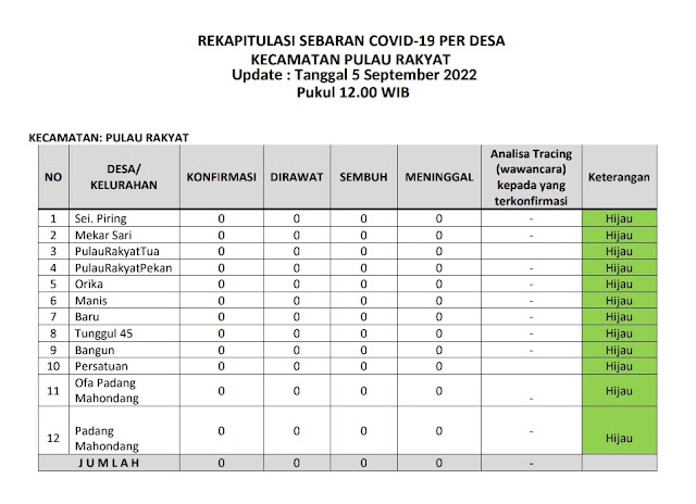 Kecamatan Pulau Rakyat berada dalam zona hijau sebaran covid 19 pada Senin (5 September 2022). Hal ini terlihat dari tabel laporan harian sebaran covid 19 dari tiap desa di wilayah Kecamatan Pulau Rakyat. Jumlah terkonfirmasi 0 kasus, jumlah pasien dirawat 0 kasus, jumlah kasus sembuh 0 kasus dan jumlah meninggal 0 kasus.