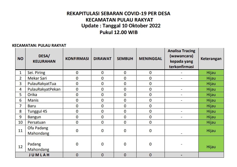 Kecamatan Pulau Rakyat berada dalam zona hijau sebaran covid 19 pada Senin (10 Oktober 2022). Hal ini terlihat dari tabel laporan harian sebaran covid 19 dari tiap desa di wilayah Kecamatan Pulau Rakyat. Jumlah terkonfirmasi 0 kasus, jumlah pasien dirawat 0 kasus, jumlah kasus sembuh 0 kasus dan jumlah meninggal dunia 0 kasus.