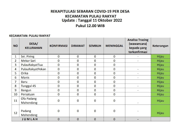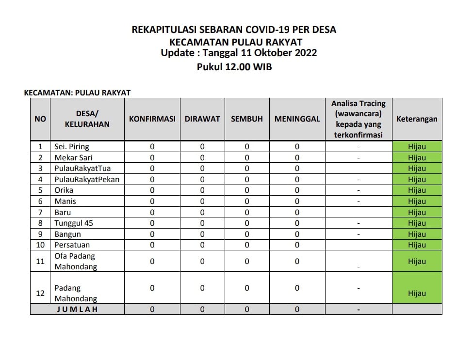Kecamatan Pulau Rakyat berada dalam zona hijau sebaran covid 19 pada Selasa (11 Oktober 2022). Hal ini terlihat dari tabel laporan harian sebaran covid 19 dari tiap desa di wilayah Kecamatan Pulau Rakyat. Jumlah terkonfirmasi 0 kasus, jumlah pasien dirawat 0 kasus, jumlah kasus sembuh 0 kasus dan jumlah meninggal dunia 0 kasus.