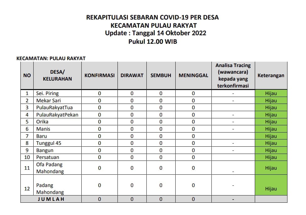 Kecamatan Pulau Rakyat berada dalam zona hijau sebaran covid 19 pada Jumat (14 Oktober 2022). Hal ini terlihat dari tabel laporan harian sebaran covid 19 dari tiap desa di wilayah Kecamatan Pulau Rakyat. Jumlah terkonfirmasi 0 kasus, jumlah pasien dirawat 0 kasus, jumlah kasus sembuh 0 kasus dan jumlah meninggal dunia 0 kasus.
