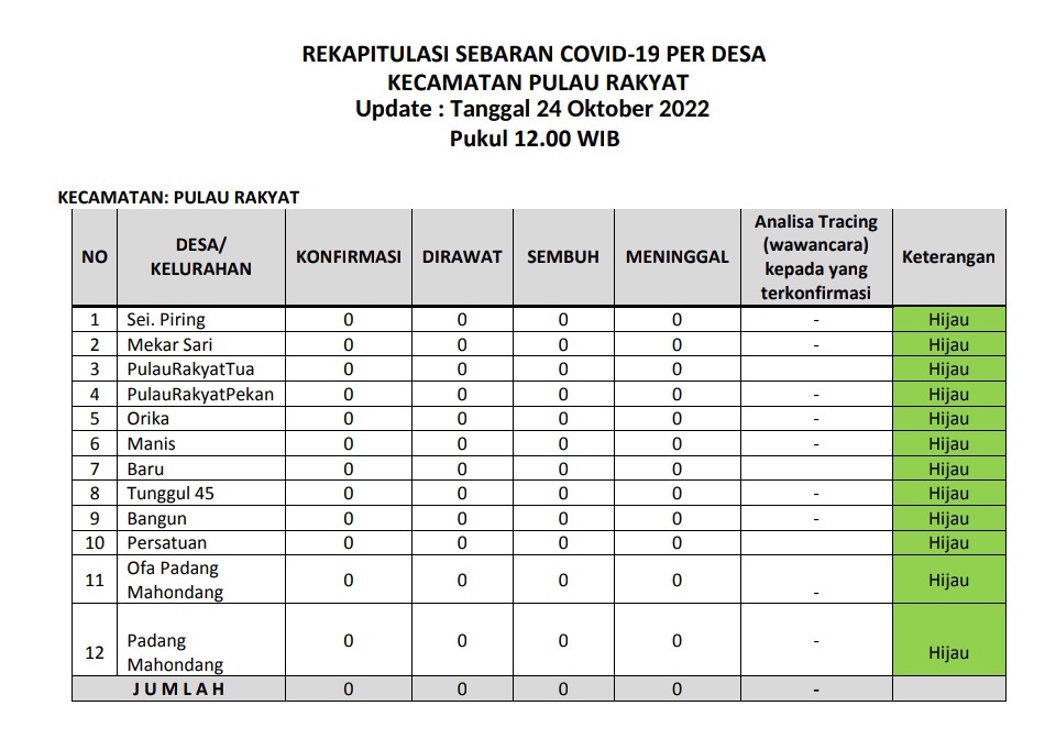 Kecamatan Pulau Rakyat berada dalam zona hijau sebaran covid 19 pada Senin (24 Oktober 2022). Hal ini terlihat dari tabel laporan harian sebaran covid 19 dari tiap desa di wilayah Kecamatan Pulau Rakyat. Jumlah terkonfirmasi 0 kasus, jumlah pasien dirawat 0 kasus, jumlah kasus sembuh 0 kasus dan jumlah meninggal dunia 0 kasus.