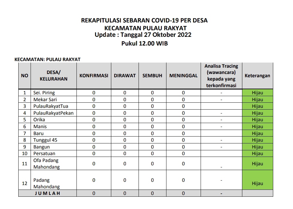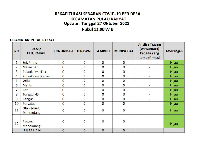 Kecamatan Pulau Rakyat berada dalam zona hijau sebaran covid 19 pada Kamis (27 Oktober 2022). Hal ini terlihat dari tabel laporan harian sebaran covid 19 dari tiap desa di wilayah Kecamatan Pulau Rakyat. Jumlah terkonfirmasi 0 kasus, jumlah pasien dirawat 0 kasus, jumlah kasus sembuh 0 kasus dan jumlah meninggal dunia 0 kasus.