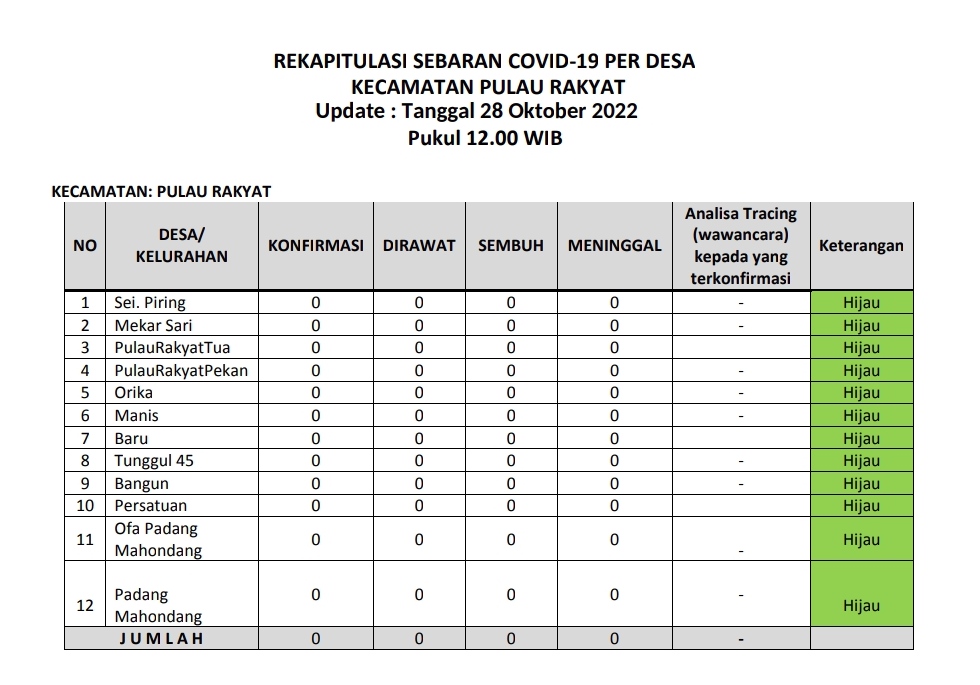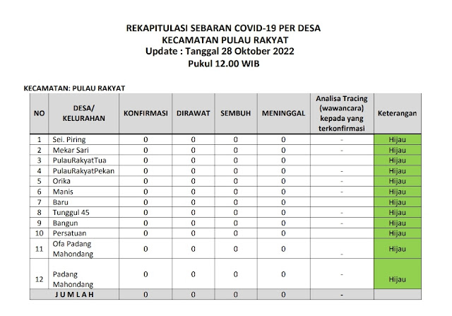 Kecamatan Pulau Rakyat berada dalam zona hijau sebaran covid 19 pada Jumat (28 Oktober 2022). Hal ini terlihat dari tabel laporan harian sebaran covid 19 dari tiap desa di wilayah Kecamatan Pulau Rakyat. Jumlah terkonfirmasi 0 kasus, jumlah pasien dirawat 0 kasus, jumlah kasus sembuh 0 kasus dan jumlah meninggal dunia 0 kasus.