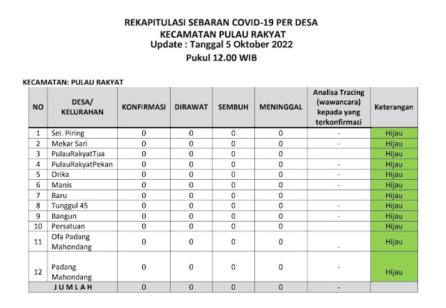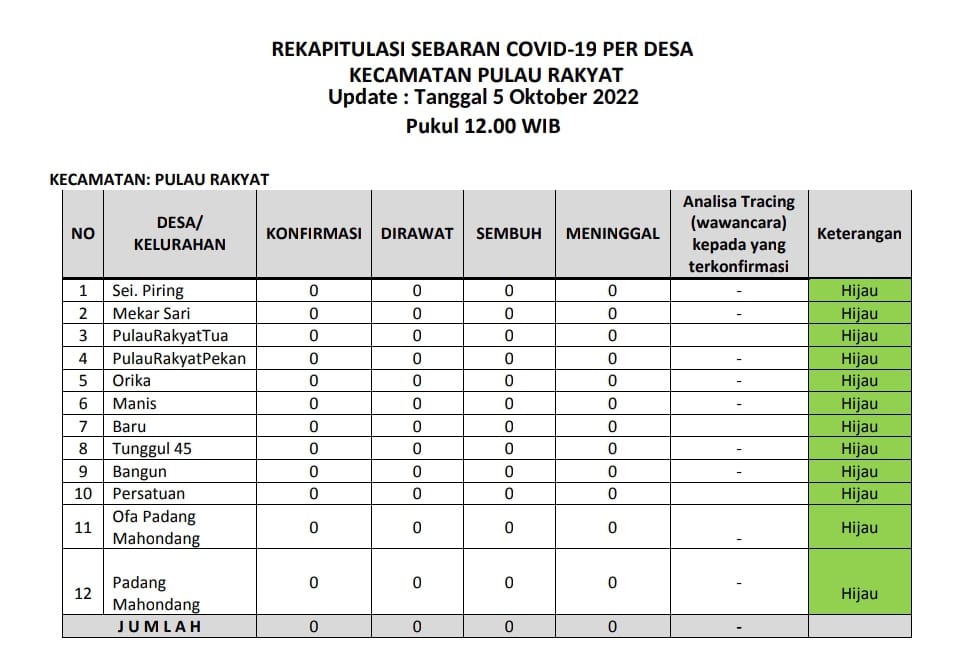 Kecamatan Pulau Rakyat berada dalam zona hijau sebaran covid 19 pada Rabu (05 Oktober 2022). Hal ini terlihat dari tabel laporan harian sebaran covid 19 dari tiap desa di wilayah Kecamatan Pulau Rakyat. Jumlah terkonfirmasi 0 kasus, jumlah pasien dirawat 0 kasus, jumlah kasus sembuh 0 kasus dan jumlah meninggal dunia 0 kasus.