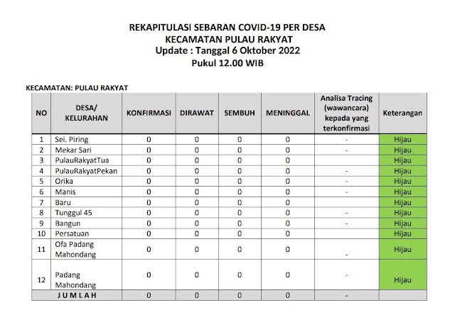 Kecamatan Pulau Rakyat berada dalam zona hijau sebaran covid 19 pada Kamis (06 Oktober 2022). Hal ini terlihat dari tabel laporan harian sebaran covid 19 dari tiap desa di wilayah Kecamatan Pulau Rakyat. Jumlah terkonfirmasi 0 kasus, jumlah pasien dirawat 0 kasus, jumlah kasus sembuh 0 kasus dan jumlah meninggal dunia 0 kasus.