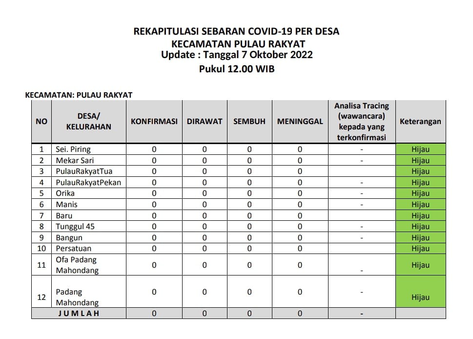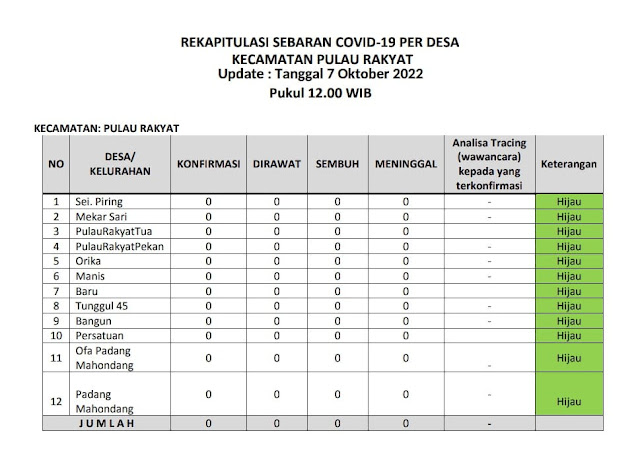 Kecamatan Pulau Rakyat berada dalam zona hijau sebaran covid 19 pada Jumat (07 Oktober 2022). Hal ini terlihat dari tabel laporan harian sebaran covid 19 dari tiap desa di wilayah Kecamatan Pulau Rakyat. Jumlah terkonfirmasi 0 kasus, jumlah pasien dirawat 0 kasus, jumlah kasus sembuh 0 kasus dan jumlah meninggal dunia 0 kasus.