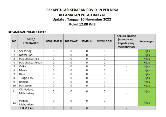 Kecamatan Pulau Rakyat berada dalam zona hijau sebaran covid 19 pada Kamis (10 November 2022). Hal ini terlihat dari tabel laporan harian sebaran covid 19 dari tiap desa di wilayah Kecamatan Pulau Rakyat. Jumlah terkonfirmasi 0 kasus, jumlah pasien dirawat 0 kasus, jumlah kasus sembuh 0 kasus dan jumlah meninggal dunia 0 kasus.