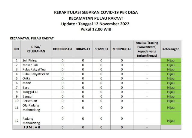 Kecamatan Pulau Rakyat berada dalam zona hijau sebaran covid 19 pada Sabtu (12 November 2022). Hal ini terlihat dari tabel laporan harian sebaran covid 19 dari tiap desa di wilayah Kecamatan Pulau Rakyat. Jumlah terkonfirmasi 0 kasus, jumlah pasien dirawat 0 kasus, jumlah kasus sembuh 0 kasus dan jumlah meninggal dunia 0 kasus.