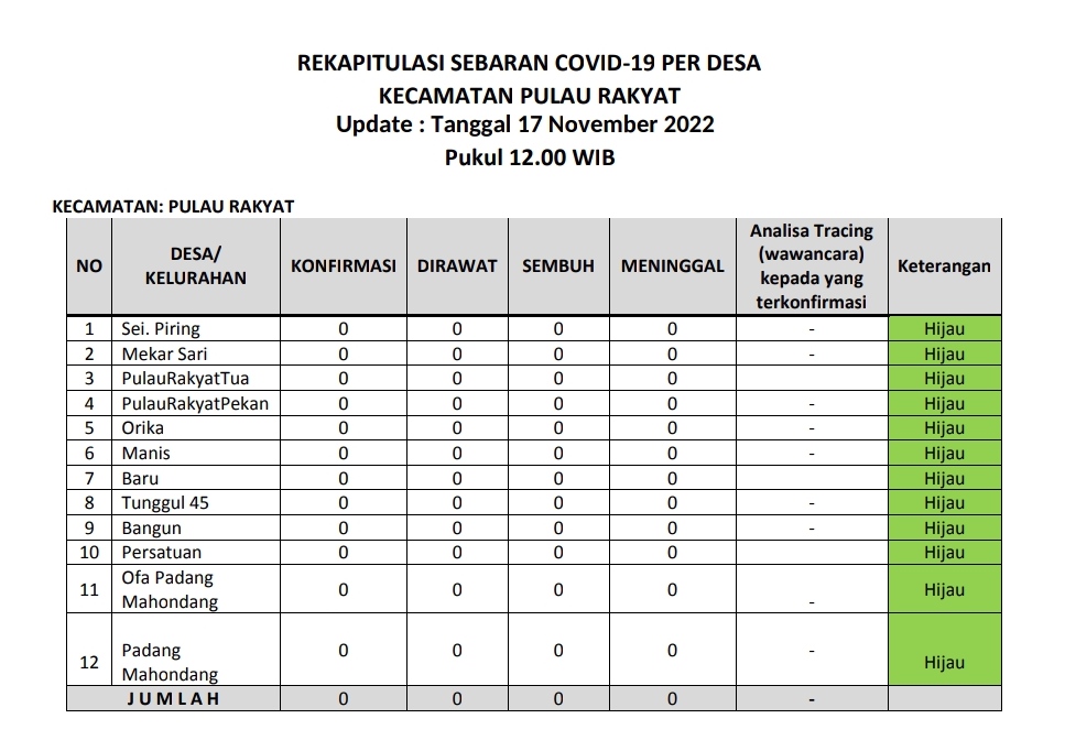 Kecamatan Pulau Rakyat berada dalam zona hijau sebaran covid 19 pada Kamis (17 November 2022). Hal ini terlihat dari tabel laporan harian sebaran covid 19 dari tiap desa di wilayah Kecamatan Pulau Rakyat. Jumlah terkonfirmasi 0 kasus, jumlah pasien dirawat 0 kasus, jumlah kasus sembuh 0 kasus dan jumlah meninggal dunia 0 kasus.