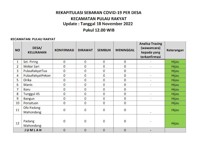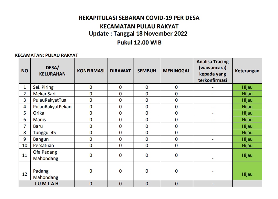 Kecamatan Pulau Rakyat berada dalam zona hijau sebaran covid 19 pada Jumat (18 November 2022). Hal ini terlihat dari tabel laporan harian sebaran covid 19 dari tiap desa di wilayah Kecamatan Pulau Rakyat. Jumlah terkonfirmasi 0 kasus, jumlah pasien dirawat 0 kasus, jumlah kasus sembuh 0 kasus dan jumlah meninggal dunia 0 kasus.