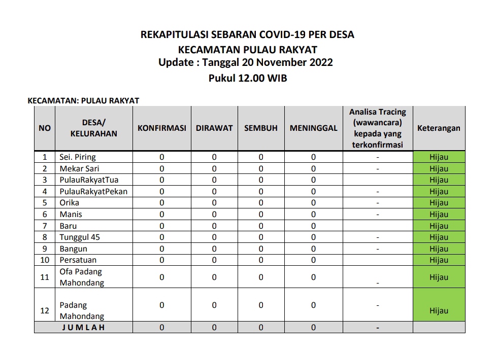 Kecamatan Pulau Rakyat berada dalam zona hijau sebaran covid 19 pada Minggu (20 November 2022). Hal ini terlihat dari tabel laporan harian sebaran covid 19 dari tiap desa di wilayah Kecamatan Pulau Rakyat. Jumlah terkonfirmasi 0 kasus, jumlah pasien dirawat 0 kasus, jumlah kasus sembuh 0 kasus dan jumlah meninggal dunia 0 kasus.