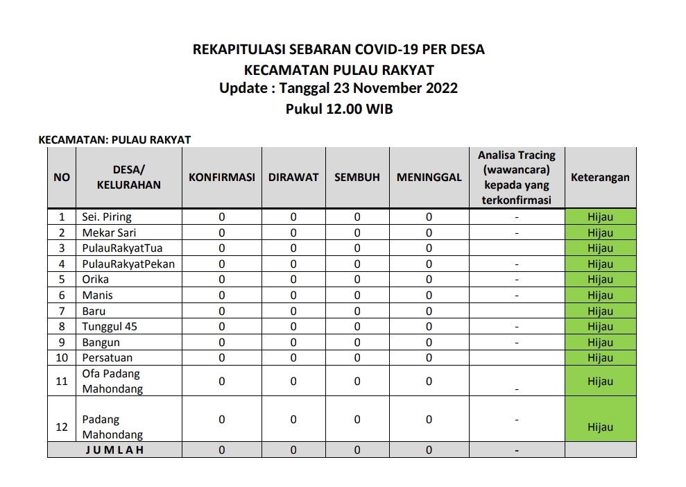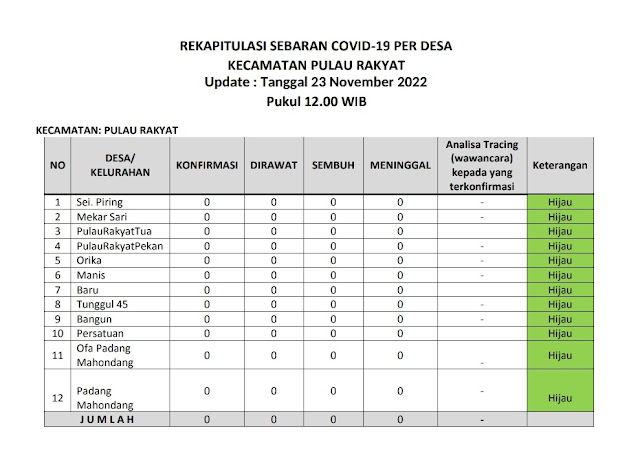 Kecamatan Pulau Rakyat berada dalam zona hijau sebaran covid 19 pada Rabu (23 November 2022). Hal ini terlihat dari tabel laporan harian sebaran covid 19 dari tiap desa di wilayah Kecamatan Pulau Rakyat. Jumlah terkonfirmasi 0 kasus, jumlah pasien dirawat 0 kasus, jumlah kasus sembuh 0 kasus dan jumlah meninggal dunia 0 kasus.