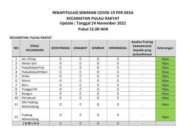 Kecamatan Pulau Rakyat berada dalam zona hijau sebaran covid 19 pada Kamis (24 November 2022). Hal ini terlihat dari tabel laporan harian sebaran covid 19 dari tiap desa di wilayah Kecamatan Pulau Rakyat. Jumlah terkonfirmasi 0 kasus, jumlah pasien dirawat 0 kasus, jumlah kasus sembuh 0 kasus dan jumlah meninggal dunia 0 kasus.
