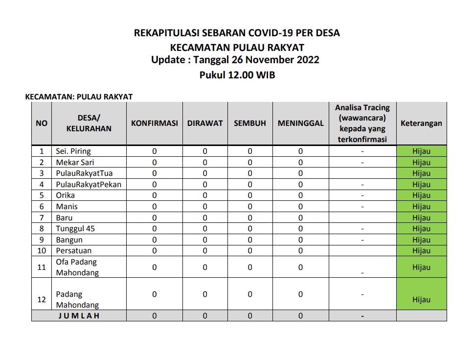 Kecamatan Pulau Rakyat berada dalam zona hijau sebaran covid 19 pada Sabtu (26 November 2022). Hal ini terlihat dari tabel laporan harian sebaran covid 19 dari tiap desa di wilayah Kecamatan Pulau Rakyat. Jumlah terkonfirmasi 0 kasus, jumlah pasien dirawat 0 kasus, jumlah kasus sembuh 0 kasus dan jumlah meninggal dunia 0 kasus.