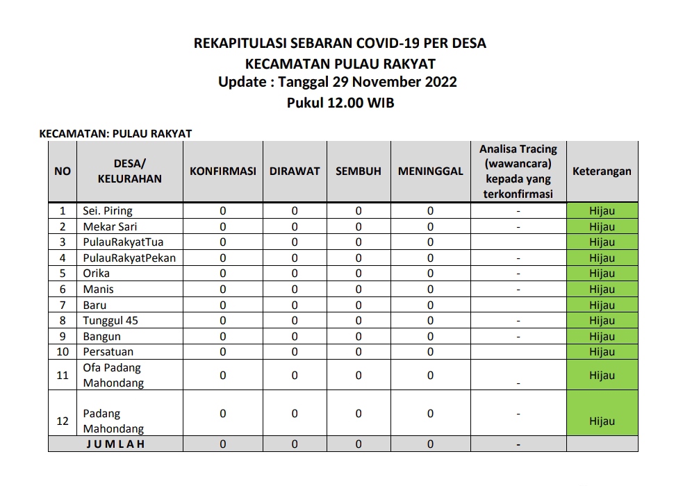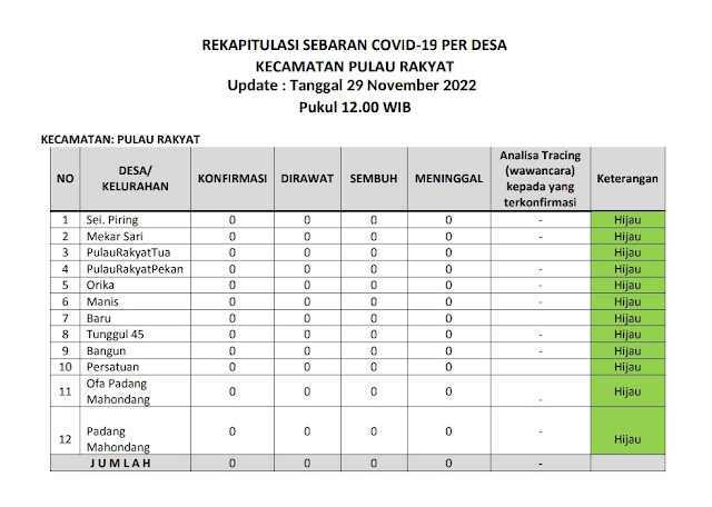 Kecamatan Pulau Rakyat berada dalam zona hijau sebaran covid 19 pada Selasa (29 November 2022). Hal ini terlihat dari tabel laporan harian sebaran covid 19 dari tiap desa di wilayah Kecamatan Pulau Rakyat. Jumlah terkonfirmasi 0 kasus, jumlah pasien dirawat 0 kasus, jumlah kasus sembuh 0 kasus dan jumlah meninggal dunia 0 kasus.