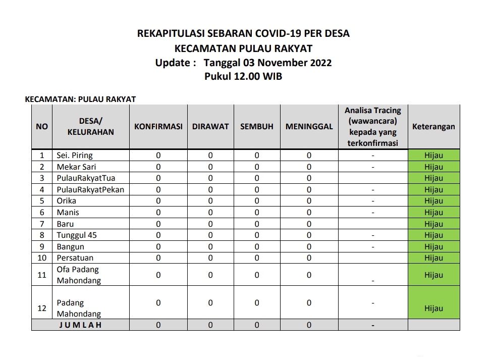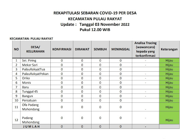 Kecamatan Pulau Rakyat berada dalam zona hijau sebaran covid 19 pada Kamis (3 November 2022). Hal ini terlihat dari tabel laporan harian sebaran covid 19 dari tiap desa di wilayah Kecamatan Pulau Rakyat. Jumlah terkonfirmasi 0 kasus, jumlah pasien dirawat 0 kasus, jumlah kasus sembuh 0 kasus dan jumlah meninggal dunia 0 kasus.