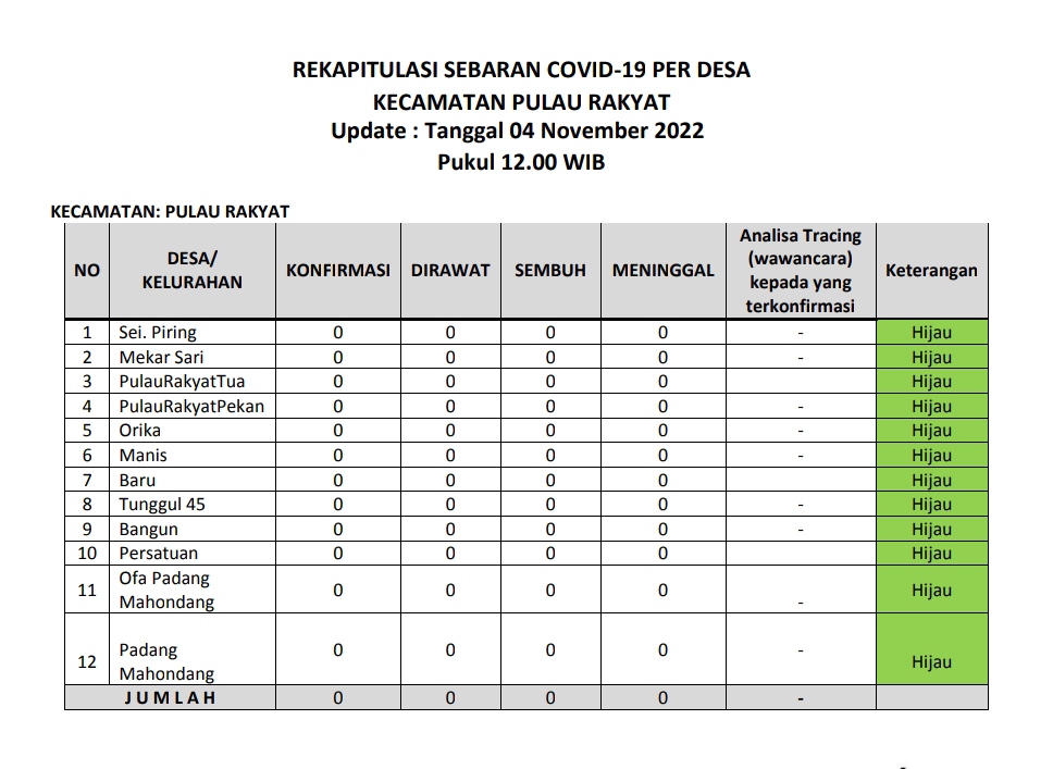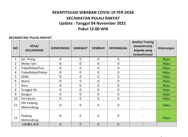 Kecamatan Pulau Rakyat berada dalam zona hijau sebaran covid 19 pada Jumat (4 November 2022). Hal ini terlihat dari tabel laporan harian sebaran covid 19 dari tiap desa di wilayah Kecamatan Pulau Rakyat. Jumlah terkonfirmasi 0 kasus, jumlah pasien dirawat 0 kasus, jumlah kasus sembuh 0 kasus dan jumlah meninggal dunia 0 kasus.