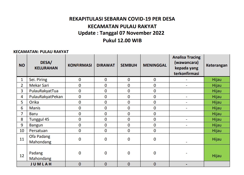 Kecamatan Pulau Rakyat berada dalam zona hijau sebaran covid 19 pada Senin (7 November 2022). Hal ini terlihat dari tabel laporan harian sebaran covid 19 dari tiap desa di wilayah Kecamatan Pulau Rakyat. Jumlah terkonfirmasi 0 kasus, jumlah pasien dirawat 0 kasus, jumlah kasus sembuh 0 kasus dan jumlah meninggal dunia 0 kasus.