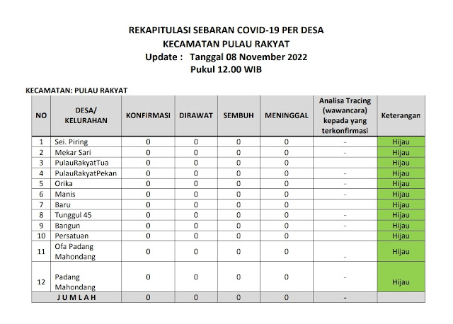 Kecamatan Pulau Rakyat berada dalam zona hijau sebaran covid 19 pada Selasa (8 November 2022). Hal ini terlihat dari tabel laporan harian sebaran covid 19 dari tiap desa di wilayah Kecamatan Pulau Rakyat. Jumlah terkonfirmasi 0 kasus, jumlah pasien dirawat 0 kasus, jumlah kasus sembuh 0 kasus dan jumlah meninggal dunia 0 kasus.