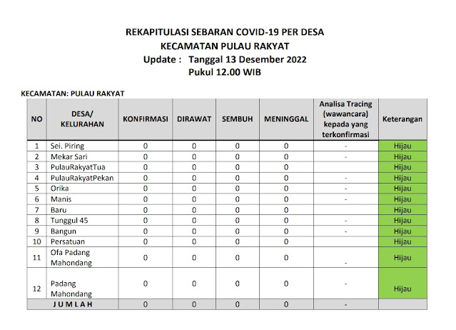 Kecamatan Pulau Rakyat berada dalam zona hijau sebaran covid 19 pada Selasa (13 Desember 2022). Hal ini terlihat dari tabel laporan harian sebaran covid 19 dari tiap desa di wilayah Kecamatan Pulau Rakyat. Jumlah terkonfirmasi 0 kasus, jumlah pasien dirawat 0 kasus, jumlah kasus sembuh 0 kasus dan jumlah meninggal dunia 0 kasus.