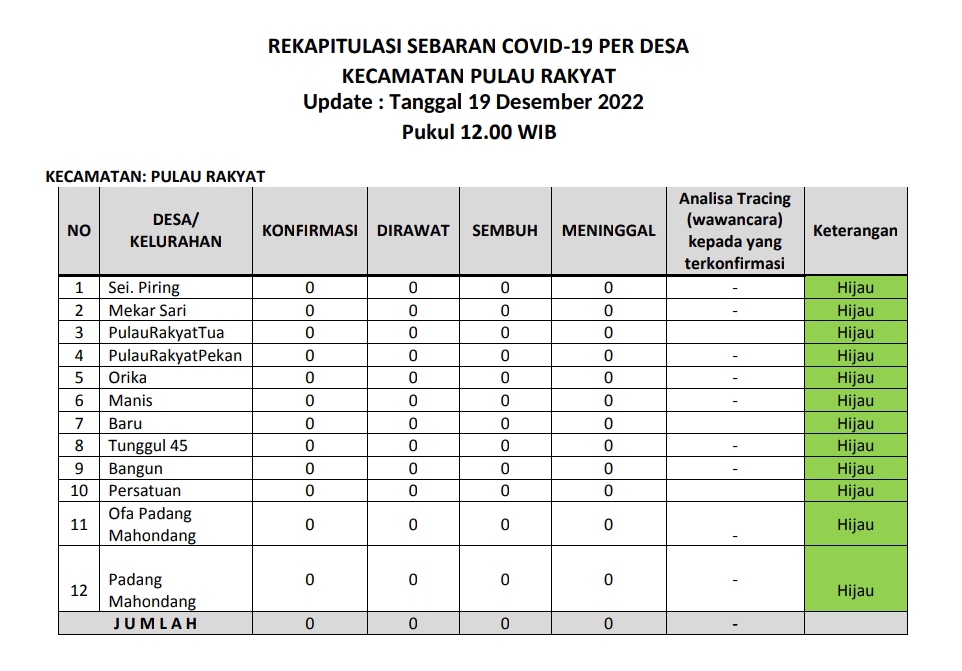 Kecamatan Pulau Rakyat berada dalam zona hijau sebaran covid 19 pada Senin (19 Desember 2022). Hal ini terlihat dari tabel laporan harian sebaran covid 19 dari tiap desa di wilayah Kecamatan Pulau Rakyat. Jumlah terkonfirmasi 0 kasus, jumlah pasien dirawat 0 kasus, jumlah kasus sembuh 0 kasus dan jumlah meninggal dunia 0 kasus.